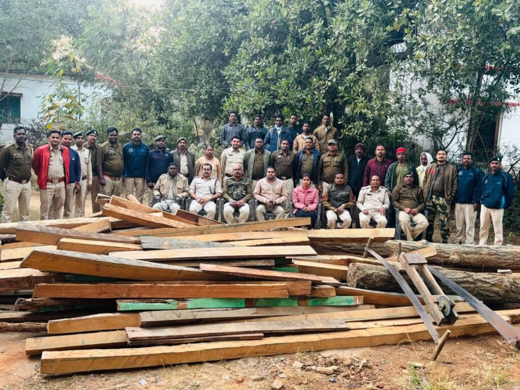 कोरबा ( सेन्ट्रल छत्तीसगढ़ ) अकित सिंह: मुख्य वन संरक्षक, वन वृत्त बिलासपुर एवं वनमण्डलाधिकारी, वनमण्डल कोरबा द्वारा वनमण्डल अंतर्गत् वनों की सुरक्षा, वन्यप्राणियों की सुरक्षा, अवैध कटाई, अवैध उत्खनन, अवैध शिकार के प्रकरणों की रोकथाम को मुख्य प्राथमिकता दी गई है। मुखबिरों से प्राप्त सूचना के अनुसार आज दिनांक 12.01.2026 को कुदमुरा परिक्षेत्र के प.स. वृत्त कुदमुरा के कुदमुरा वन परिसर में ग्राम कुदमुरा में 03 अभियुक्तों/ग्रामीणों के कुल 08 घर एवं बाड़ी तथा रेशम विभाग कुदमुरा के परिसर में नियमानुसार सर्च वारंट जारी कर पुलिस बल की उपस्थिति में उपवनमण्डलाधिकारी दक्षिण कोरबा, वन परिक्षेत्र अधिकारी करतला, वन परिक्षेत्र अधिकारी पसरखेत, वन परिक्षेत्र अधिकारी बालको, वन परिक्षेत्र अधिकारी कुदमुरा एवं वनमण्डल के अन्य परिक्षेत्र में कार्यरत लगभग 40 वन अधिकारियों के साथ 03 पृथक् पृथक् सर्च टीम का गठन कर जारी किये गये सर्च वारंट के तहत् श्री सहनीराम राठिया, उपवनक्षेत्रपाल, वृत्त वन अधिकारी केराकछार, परिक्षेत्र पसरखेत, श्री कांति कुमार कंवर, उपवनक्षेत्रपाल, वृत्त वन अधिकारी बालको, परिक्षेत्र बालको, श्री अनिल कुमार कंवर, वनपाल, वृत्त वन अधिकारी अजगरबहार दक्षिण, परिक्षेत्र बालको द्वारा विधिवत् सर्च वारंट की तामिली कर करतला थाना के पुलिस कर्मी एवं वनविभाग के अधिकारी/कर्मचारी के सक्रिय एवं सकारात्मक सहयोग से नियमानुसार वृहद् तलाशी की कार्यवाही कुल 08 घरों एवं संलग्न बाड़ी में की गई जो कि पूर्णतः शांतिपूर्ण वातावरण में बिना किसी विवाद के सम्पन्न हुई। तलाशी में वृहद् पैमाने पर अभियुक्त (1) रामदास महंत पिता स्व. गोपालदास, साकिन कुदमुरा (2) श्यामदास महंत पिता स्व. गोपालदास साकिन कुदमुरा (3) लछनसिंह राठिया पिता स्व. दिलबोध, साकिन कुदमुरा के घर एवं बाड़ी तथा रेशम विभाग कुदमुरा के परिसर से सागौन एवं साल प्रजाति के ईमारती लगभग 366 नग 9.933 घ.मी., लगभग शासकीय वनोपज तथा हाथआरा 02 नग, चक्कादार कनासी 02 नग को नियमानुसार जप्त किया गया है। जिसका वन विभाग के वाणिज्यिक दर अनुसार लगभग मूल्य 221528.00 रुपये है।