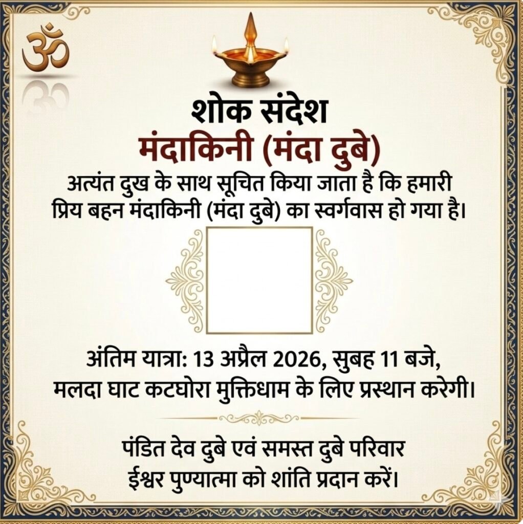इस अपार दुख की घड़ी में राजपुरोहित पं. देव दुबे, समस्त दुबे परिवार ने इष्ट मित्रों और परिजनों को सूचित करते हुए दिवंगत आत्मा की शांति हेतु प्रार्थना की है।