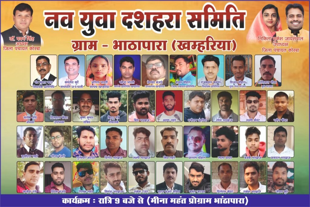 सेंट्रल छत्तीसगढ़ / विनोद उपाध्याय (हरदीबाजार).. पाली ब्लाक अंतर्गत ग्राम पंचायत खम्हरिया के भाठापारा में नव युवा दशहरा समिति के द्वारा दशहरा उत्सव का कार्यक्रम 14 अक्टूबर को किया जा रहा है जिसमें मुख्य अतिथि डॉक्टर पवन सिंह जिला पंचायत अध्यक्ष रहेंगे विशिष्ट अतिथि में जिला पंचायत उपाध्यक्ष श्रीमती निकिता मुकेश जायसवाल, विधायक प्रतिनिधि नन्द कुमार मरार,सभापति कमलेश कुर्रे रहेंगे कार्यक्रम की अध्यक्षता ग्राम सरपंच श्रीमती अनीता महेंद्र भारती करेंगे दशहरा उत्सव रात्रि 9:00 बजे रावण दहन किया जाएगा एवं रात्रि कालीन के लिए मीना महंत का प्रोग्राम रखा गया है इस कार्यक्रम को सफल बनाने में उप सरपंच पंच सहित ग्रामवासी लगे हुए हैं कार्यक्रम में अधिक से अधिक संख्या में पहुंचकर दशहरा उत्सव का आनंद लेने के लिए ग्राम सरपंच श्रीमती अनीता महेंद्र भारती ने आग्रह किया है ।।