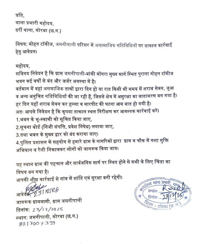 “हमारे ग्राम जमनीपाली बस्ती में अवैध शराब और गांजा बिक्री का ग्राफ लगातार बढ़ रहा है। प्रशासन को बार-बार अवगत कराने के बाद भी स्थिति जस की तस बनी हुई है। अब हमारी बर्दाश्त की सीमा समाप्त हो चुकी है।”