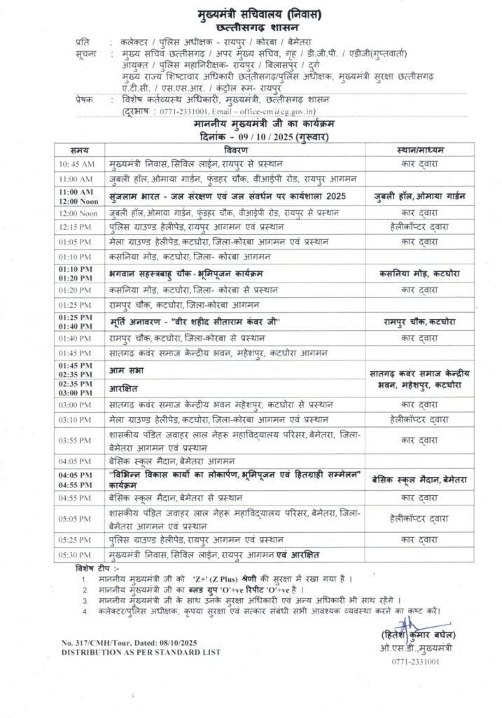 मुख्यमंत्री विष्णुदेव साय करीब दो घंटे तक कटघोरा में रुकेंगे और फिर दोपहर 3 बजे बेमेतरा के लिए रवाना हो जाएंगे।