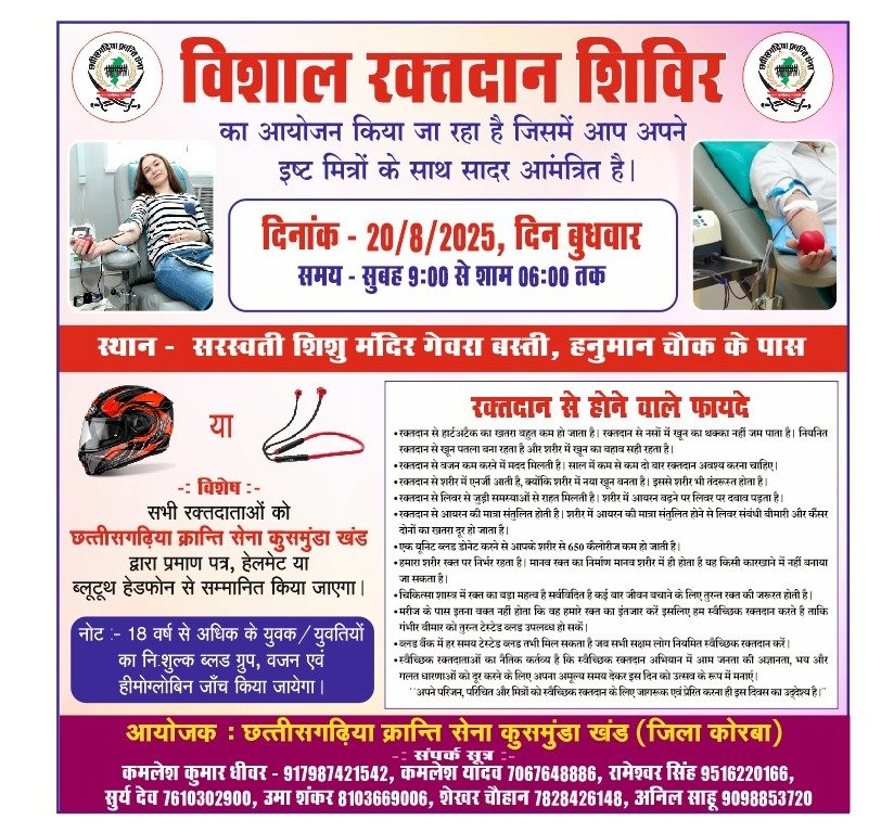 कोरबा:- (सेन्ट्रल छत्तीसगढ़) :;छत्तीसगढ़िया क्रान्ति सेना परिवार के तरफ ले कल 20 अगस्त के लहू दान शिविर कुसमुंडा खड़ म लगाए जात हे आप सब्बो सेनानी पदाधिकारी मन ले निवेदन हे कल आप मन ये शिविर में आके अपन लहू दान जरूर करव ताकि हमर लहू कोनो जरूरत मंद के काम आ सके ।।