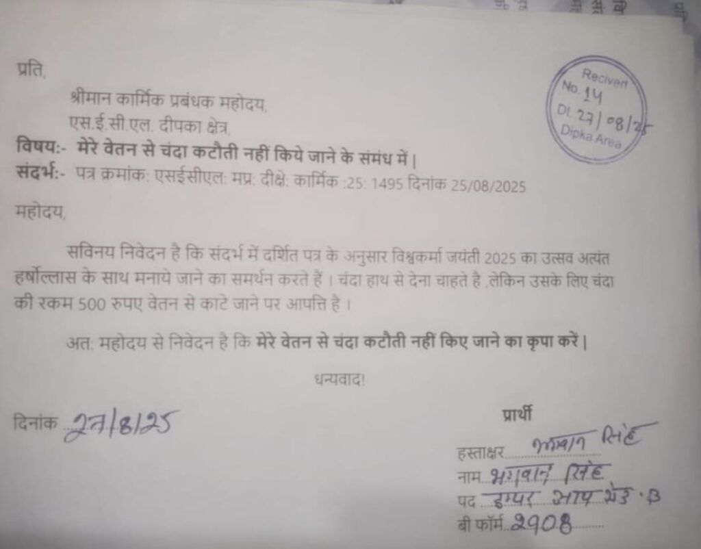 कोरबा/दीपका (सेन्ट्रल छत्तीसगढ़) साउथ ईस्टर्न कोलफील्ड्स लिमिटेड (SECL) दीपका क्षेत्र में मजदूरों का गुस्सा फूट पड़ा है। 100 से अधिक श्रमिकों ने कार्मिक प्रबंधक को पत्र सौंपकर सैलरी से जबरन विश्वकर्मा पूजा चंदा कटौती का विरोध किया है।