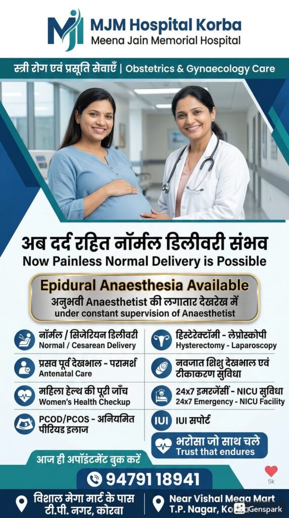 कोरबा ( सेन्ट्रल छत्तीसगढ़) हिमांशु डिक्सेना: मातृत्व का सुख अब दर्द नहीं, बल्कि एक सुखद अहसास बनेगा। शहर के प्रतिष्ठित मीना जैन मेमोरियल (MJM) हॉस्पिटल ने चिकित्सा के क्षेत्र में एक आधुनिक कदम उठाते हुए “पेनलेस नॉर्मल डिलीवरी” (दर्द रहित सामान्य प्रसव) की सुविधा शुरू की है। यह तकनीक उन गर्भवती महिलाओं के लिए किसी वरदान से कम नहीं है, जो प्रसव के दौरान होने वाले असहनीय दर्द से डरती हैं।
