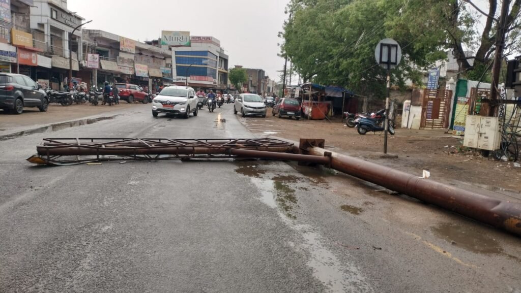 कटघोरा ( सेन्ट्रल छत्तीसगढ़ ) : स्थानीय न्यू बस स्टैंड के पास उस वक्त अफरा-तफरी मच गई, जब तेज आंधी और तूफान के कारण लोक निर्माण विभाग (PWD) द्वारा लगाया गया एक विशालकाय सांकेतिक बोर्ड (Signage Board) अचानक उखड़कर मुख्य मार्ग पर गिर गया।