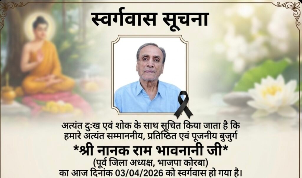 कोरबा ( सेन्ट्रल छत्तीसगढ़ ) हिमांशु डिक्सेना : भारतीय जनता पार्टी के वरिष्ठ नेता और पूर्व जिला अध्यक्ष श्री नानक राम भावनानी जी का दिनांक 03 अप्रैल 2026 को निधन हो गया। उनके निधन की खबर से कोरबा सहित पूरे प्रदेश के भाजपा कार्यकर्ताओं और सामाजिक हल्कों में शोक की लहर दौड़ गई है।