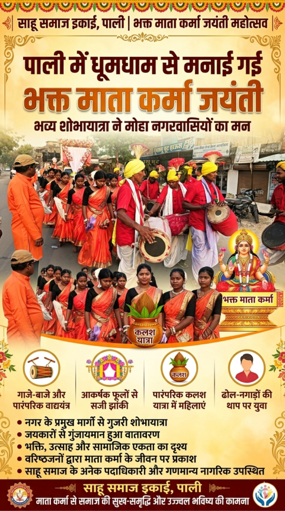 कोरबा ( सेन्ट्रल छत्तीसगढ़ ) हिमांशु डिक्सेना / पाली: पाली में धूमधाम से मनाई गई भक्त माता कर्मा जयंती, भव्य शोभायात्रा ने मोहा नगरवासियों का मनस्थानीय साहू समाज इकाई द्वारा आराध्य देवी भक्त माता कर्मा की जयंती बड़े हर्षोल्लास, श्रद्धा और सामाजिक एकजुटता के साथ मनाई गई। इस पावन अवसर पर नगर में भक्ति और उत्साह का अनूठा संगम देखने को मिला, जिसमें समाज के हर वर्ग ने बढ़-चढ़कर हिस्सा लिया।