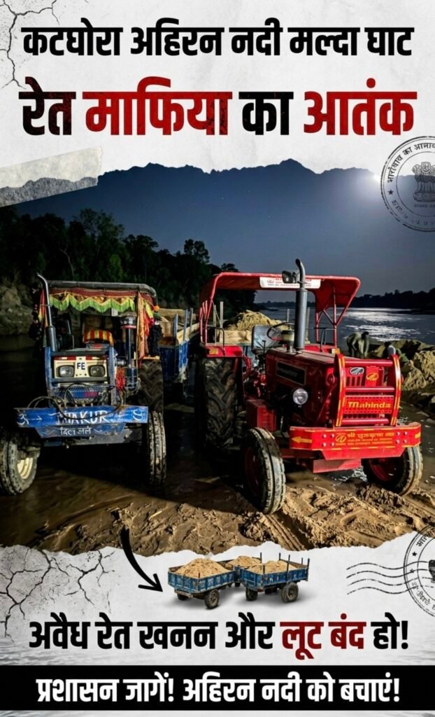 कटघोरा/कोरबा ( सेन्ट्रल छत्तीसगढ़ ) आशुतोष शर्मा: जब पूरा शहर सोता है, तब अहिरन नदी के सीने को चीरने का खेल शुरू होता है। कटघोरा क्षेत्र के मल्दा घाट पर रेत माफियाओं का आतंक इस कदर बढ़ गया है कि रात के अंधेरे में दर्जनों ट्रैक्टरों की गूँज सुनाई देती है। सबसे चौंकाने वाली बात यह है कि यह सब पुलिस और प्रशासन की नाक के नीचे हो रहा है, जिससे मिलीभगत की बूआ रही है।