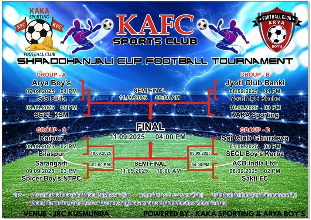 कोरबा:- काका स्पोर्टिंग क्लब और आर्य बॉयज के तत्वाधान में अंतराज्यीय फुटबॉल प्रतियोगिता का आयोजन कोयला नगरी कुसमुंडा के जे.आर.सी मैदान में आगामी 07 सितम्बर से होने जा रहा है।